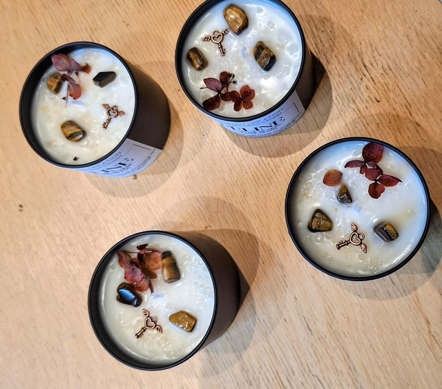Planquée dans la cire, des pierre d’œil de tigre : protectrice, stabilisante, elle t’aide à garder confiance, repousser les mauvaises vibes et foncer avec courage.